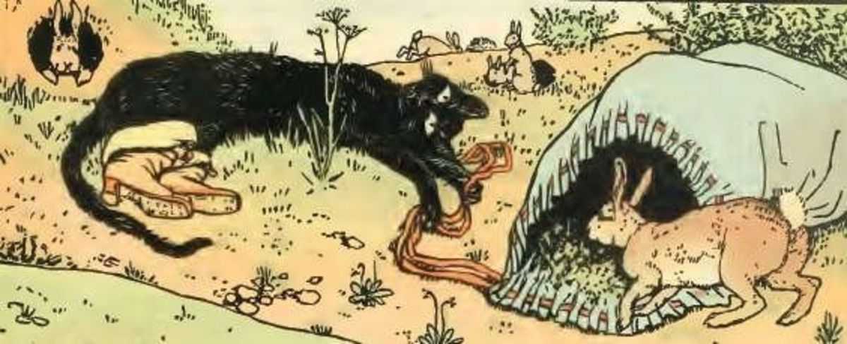 Кот, естественно, с этим решением был несогласен, он попросил хозяина купить ему мешок и капусту, чтобы показать, какую пользу он сможет принести. Сын мельника послушался и принес ему заказанные вещи. Кот отправился в лес, где притаился мертвым. На приманку клюнул глупый кролик, усатый охотник освежевал животное и отправился с дарами во дворец к королю.