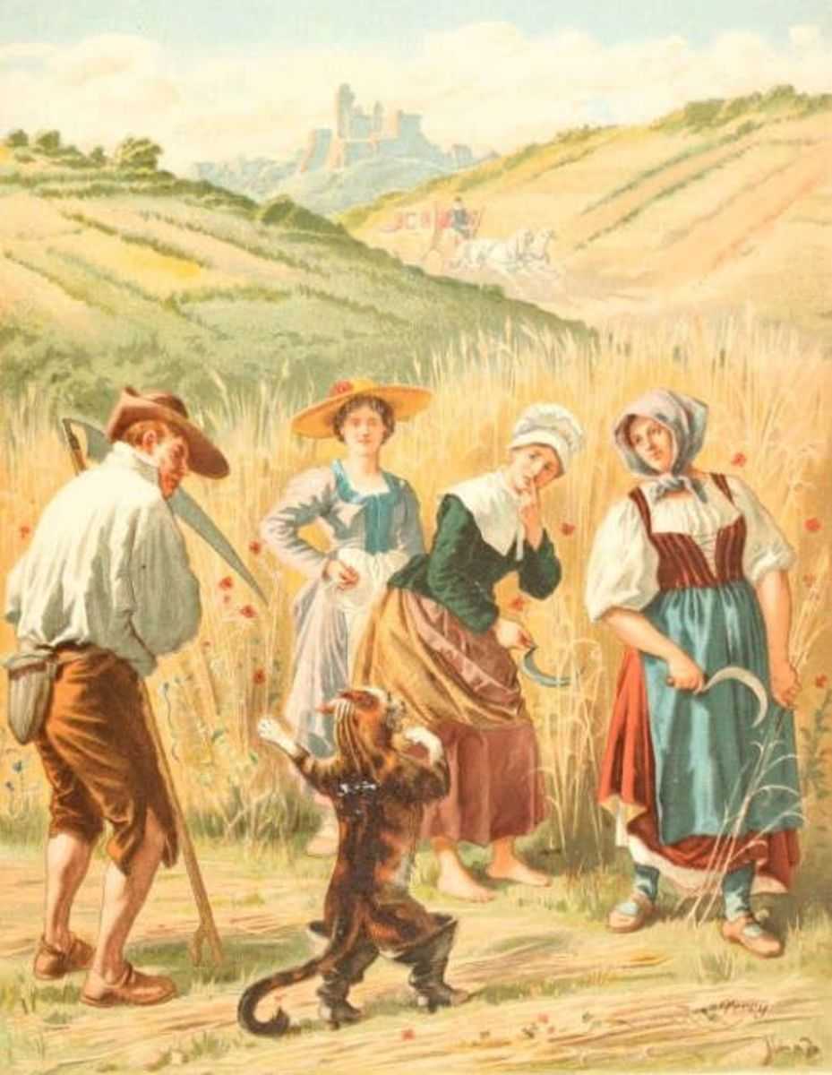 Кот тем временем побежал вперед и говорил косцам, жнецам и прочим крестьянам,чтобы они называли своим владельцем маркиза Карабаса, под угрозой немедленной и жестокой расправы.