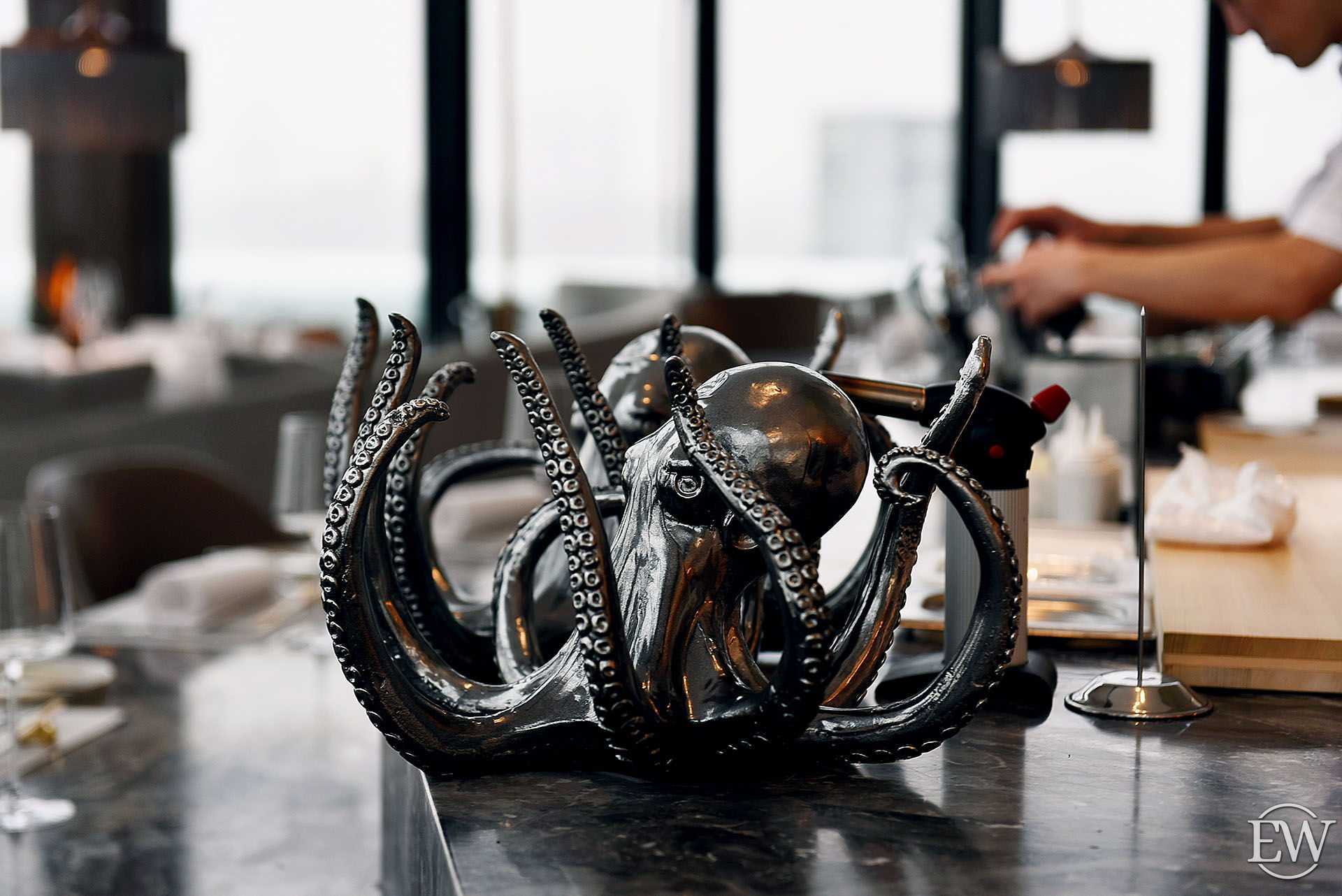 Нельзя не упомянуть уникальные подставки, сделанные на заказ в виде осьминогов, танцующих на своих хвостах рыб и других морских существ.