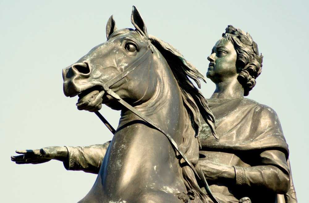 Всадник на вздыбленном коне, обозревает город и Неву с высокого пьедестала. Сначала кажется, что у фигуры 3 точки опоры. Исследования ХХ века показали, что хвост коня, соединенный с изогнувшейся змеей – это не опора, а балансир. Жесткий каркас находится только в задних ногах коня.