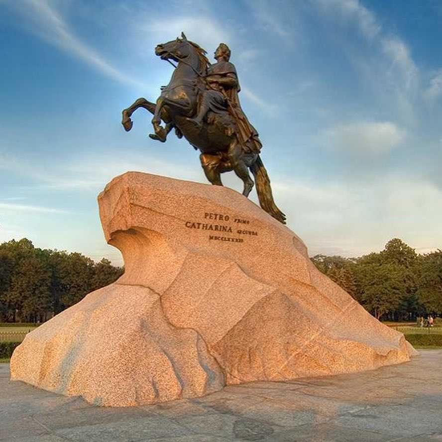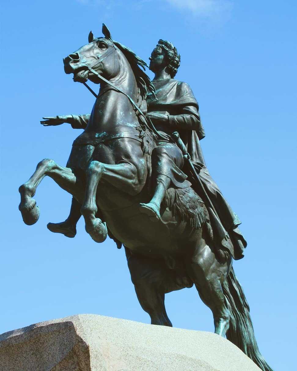 Памятник на Сенатской площади в Санкт-Петербурге изображает Петра I, сидящего на вздыбленном коне. Он стоит на вершине постамента-скалы, а у ног лошади лежит поверженная змея. Все это символизирует преодоленные императором трудности и враждебные силы.