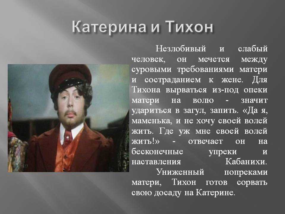 Он не желает наказывать свою жену, но по приказанию матери все же бьет ее и ругает, хотя сам жалеет ее при этом. Когда встает вопрос о том, кто виновен в смерти грешной Катерины, слабый Тихон прямо обвиняет свою мать.