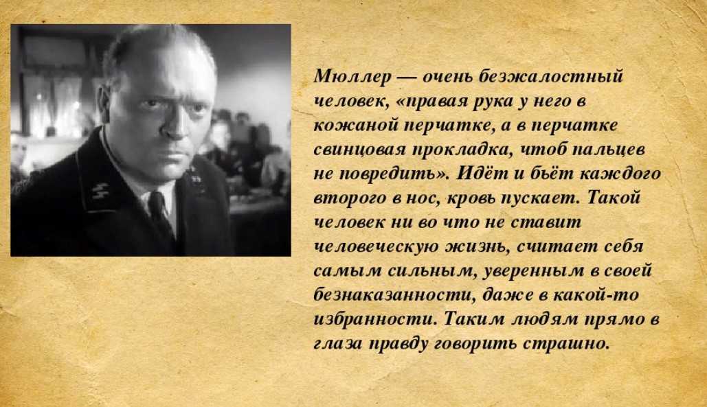 Мюллер – жестокий и безжалостный комендант лагеря. Мюллер проявляет садистские наклонности, наслаждаясь избиением пленных и используя жестокие методы, такие как свинцовая вкладка в перчатке. Его безжалостные действия раскрывают его жестокий характер и безнравственное поведение.