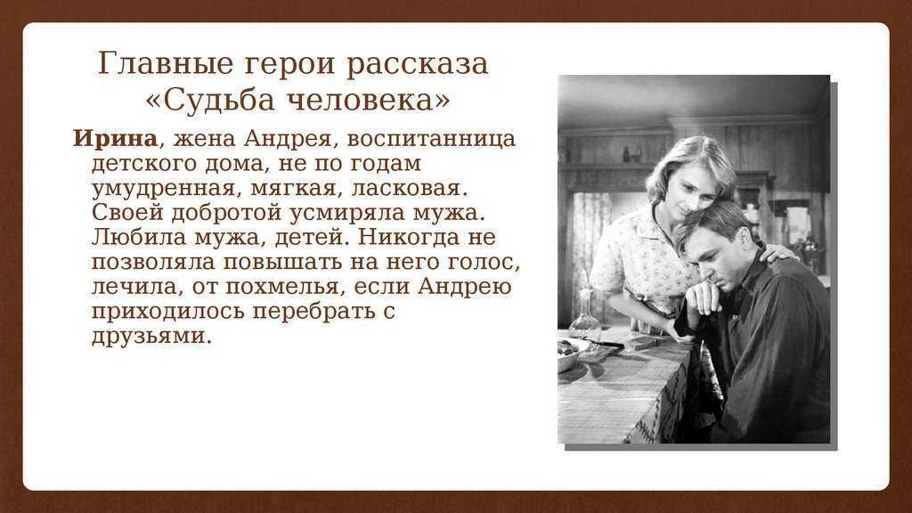 - Андрей Соколов – обычный человек, один из многих, которым пришлось оставить мирное существование ради того, чтобы отстоять Родину. Простой и счастливый быт он меняет на опасности войны, даже не представляя, как можно остаться в стороне. В экстремальных обстоятельствах он сохраняет душевное благородство, проявляет силу воли и стойкость. Под ударами судьбы он сумел не сломаться. И найти новый смысл жизни, что выдает в нем доброту и отзывчивость, ведь он приютил сироту.