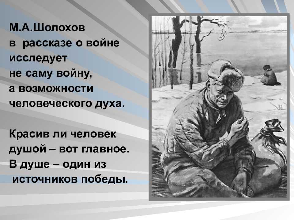 - Рассказ «Судьба человека» Михаила Шолохова ярко подчеркивает патриотическую направленность событий Великой Отечественной войны. Автор считает, что борьба за жизнь и свободу родины – это моральный долг каждого гражданина, и нацизм, стремящийся уничтожить государства и народы, должен быть осужден.