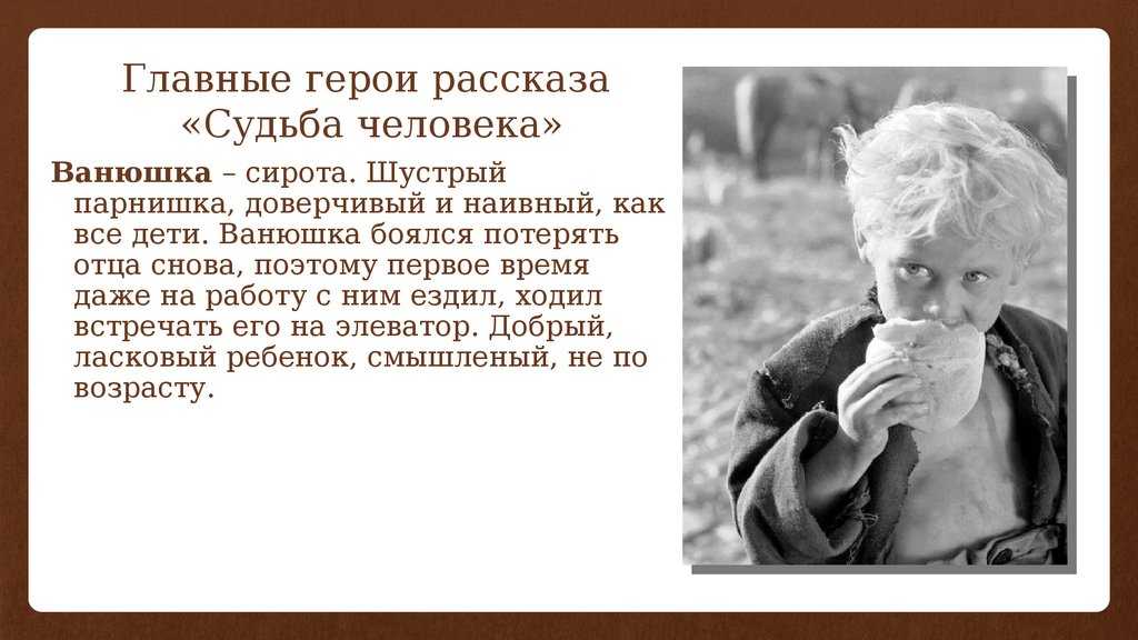 - Ванюшка – одинокий мальчик, которому приходится ночевать, где придется. Мать его убили при эвакуации, отца на фронте. Оборванным, пыльным, в арбузном соке – таким он предстал перед Соколовым. И Андрей не мог оставить ребенка, представился его отцом, дав шанс на дальнейшую нормальную жизнь и себе, и ему.