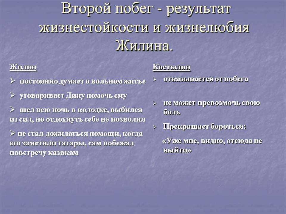 Костылин и в плену, и при побеге оказался не соратником Жилина, а обузой. Еще до плена можно догадаться, что ведут себя герои по- разному. В одних и тех же условиях один герой проявляет стойкость, мужество, волю, находчивость, активно борется, а другой только страдает, проявляет эгоизм, плохо переносит усталость, боль, бездействует.