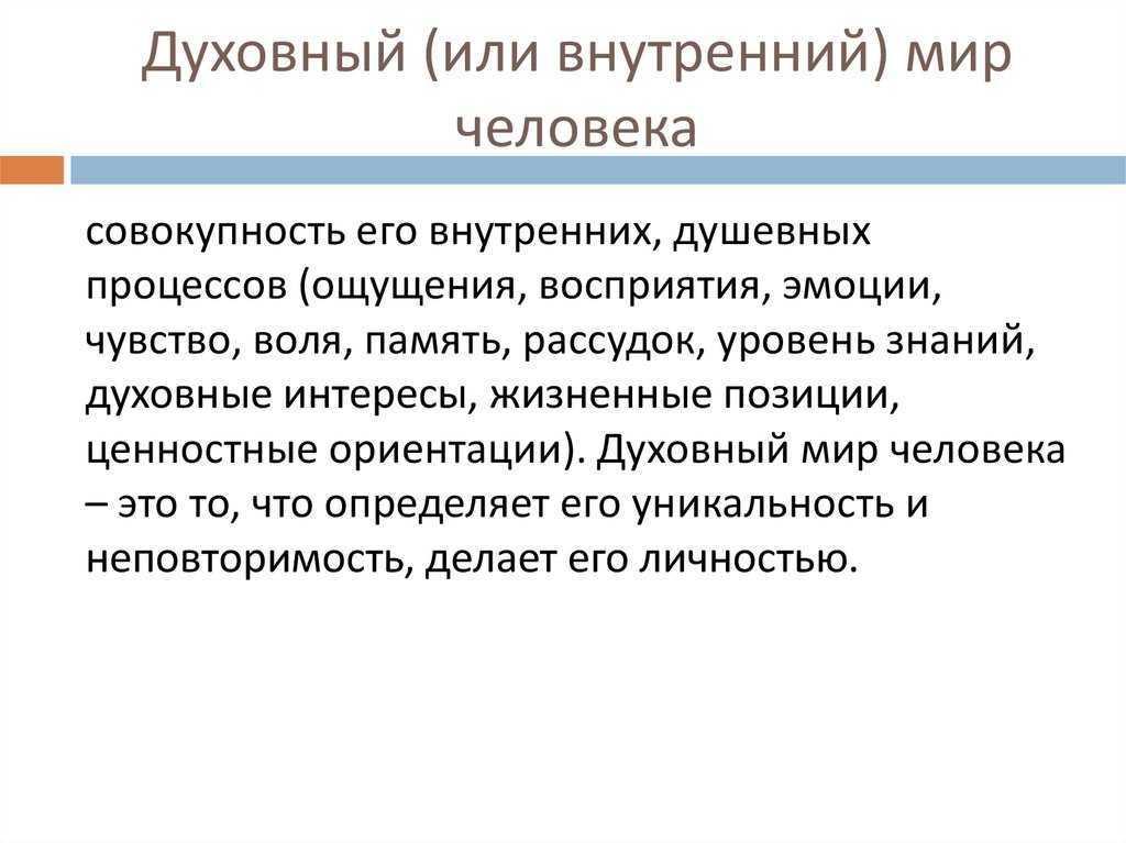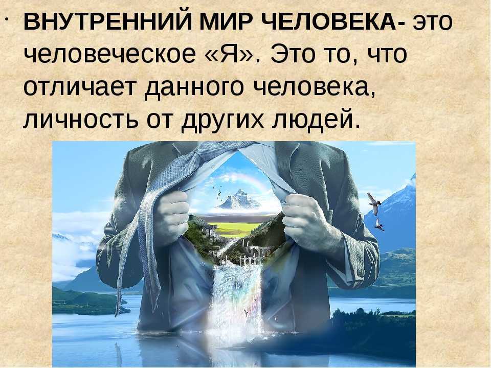Внутренний мир — это совокупность мыслей, чувств и эмоций, которые присутствуют внутри каждого человека и являются частью его личности. Это та область нашего сознания, которая скрыта от других людей, и может быть доступна только нам самим.