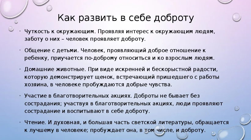 В себе тоже можно развить доброту. Начинать надо постепенно, с малых проявлений, шаг за шагом. Вы сами не заметите, как станете гораздо добрее, подсознательно захотите делать добро искренне, от души. С чего начать: