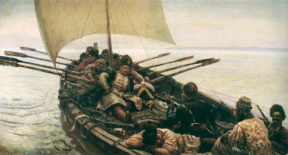 Некоторые казаки занимаются игрой на музыкальных инструментах, а часть гребет, позволяя лодке не сбавлять ход.