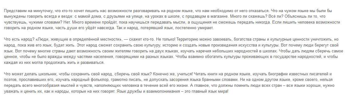 Мы стремимся путешествовать по разным странам, знать другие языки. В основном сейчас люди учат английский язык, ведь его знание открывает множество возможностей. Но, не смотря на это, необходимо знать и использовать свой родной язык. Ведь бессмертие народа – это его язык. Нет универсального языка, у каждого народа он свой. И каждый язык прекрасен. Мы чтим русский язык, считаем его самым красивым и богатым языком в мир, и это бесспорно верное утверждение. Но для каждого человека его родной язык считается самым близким и приятным. Нужно с уважением относиться ко всем языкам, ведь это культура народа, так же как флаг, герб и гимн страны.