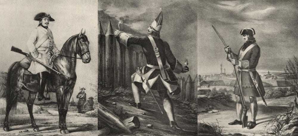 Рядовой драгун, гренадер пехотного полка с ручной гранатой и солдат-преображенец