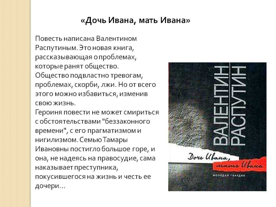 - Дочь Ивана, мать Ивана — краткое содержание повесть Распутина Главную героиню повести зовут Тамара Ивановна. Женщина живет вместе со своей семьей – шестнадцатилетней дочкой Светланой, пятнадцатилетним сыном Иваном и мужем Анатолием в небольшом сибирском городке.